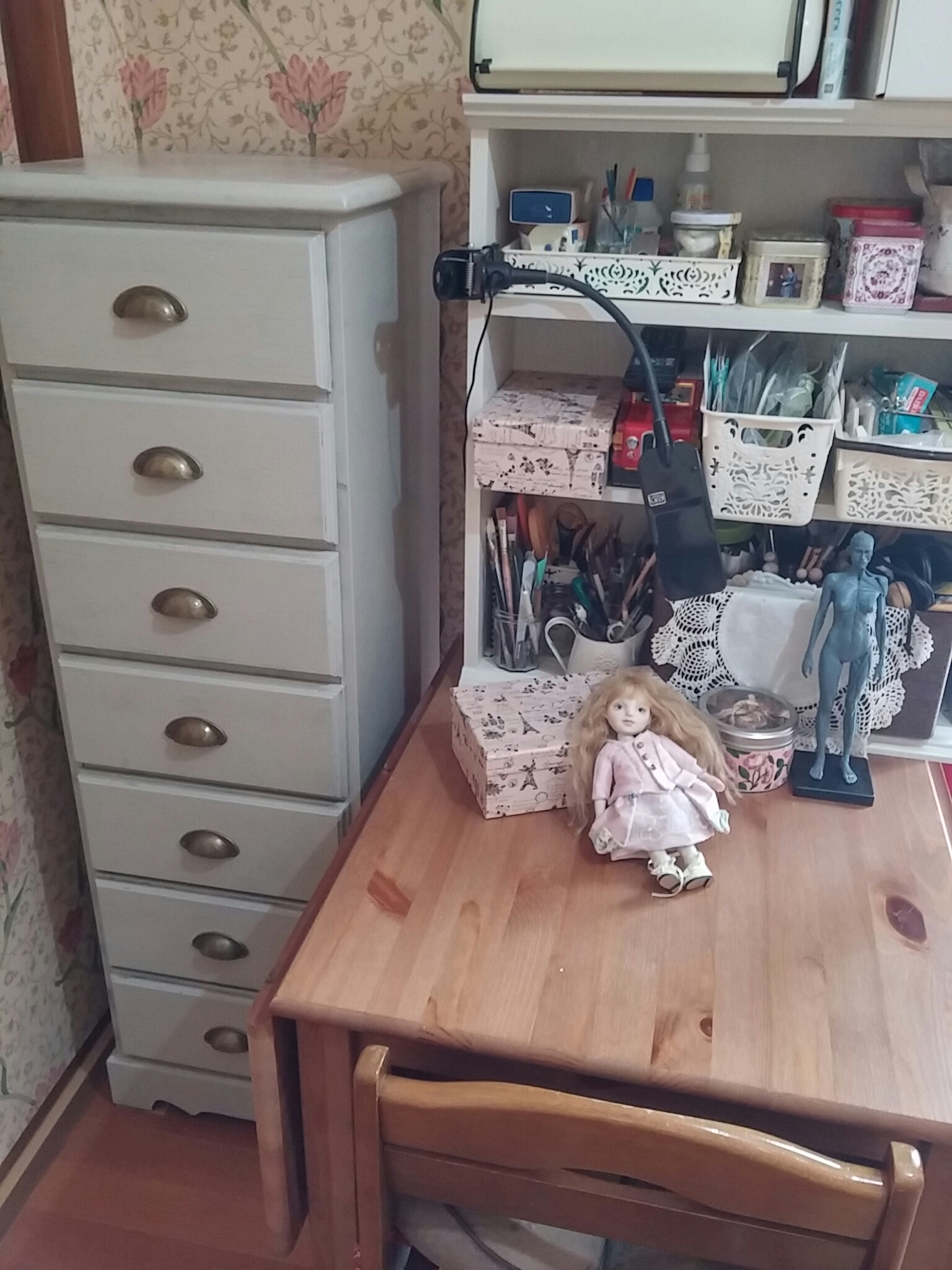 どうです?シャビーシックになりましたね!こちらのコーナーはビスクドールの工房にしているので、道具箱として使うつもりです。