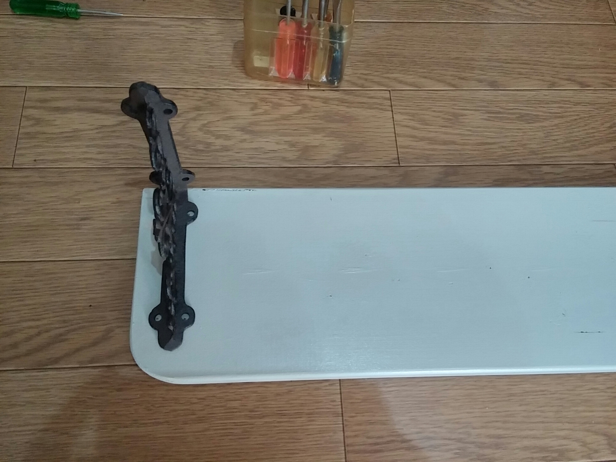 次にあらかじめ買っておいたブラケット(受け手の金具)をドライバーで棚板に取り付けます。
