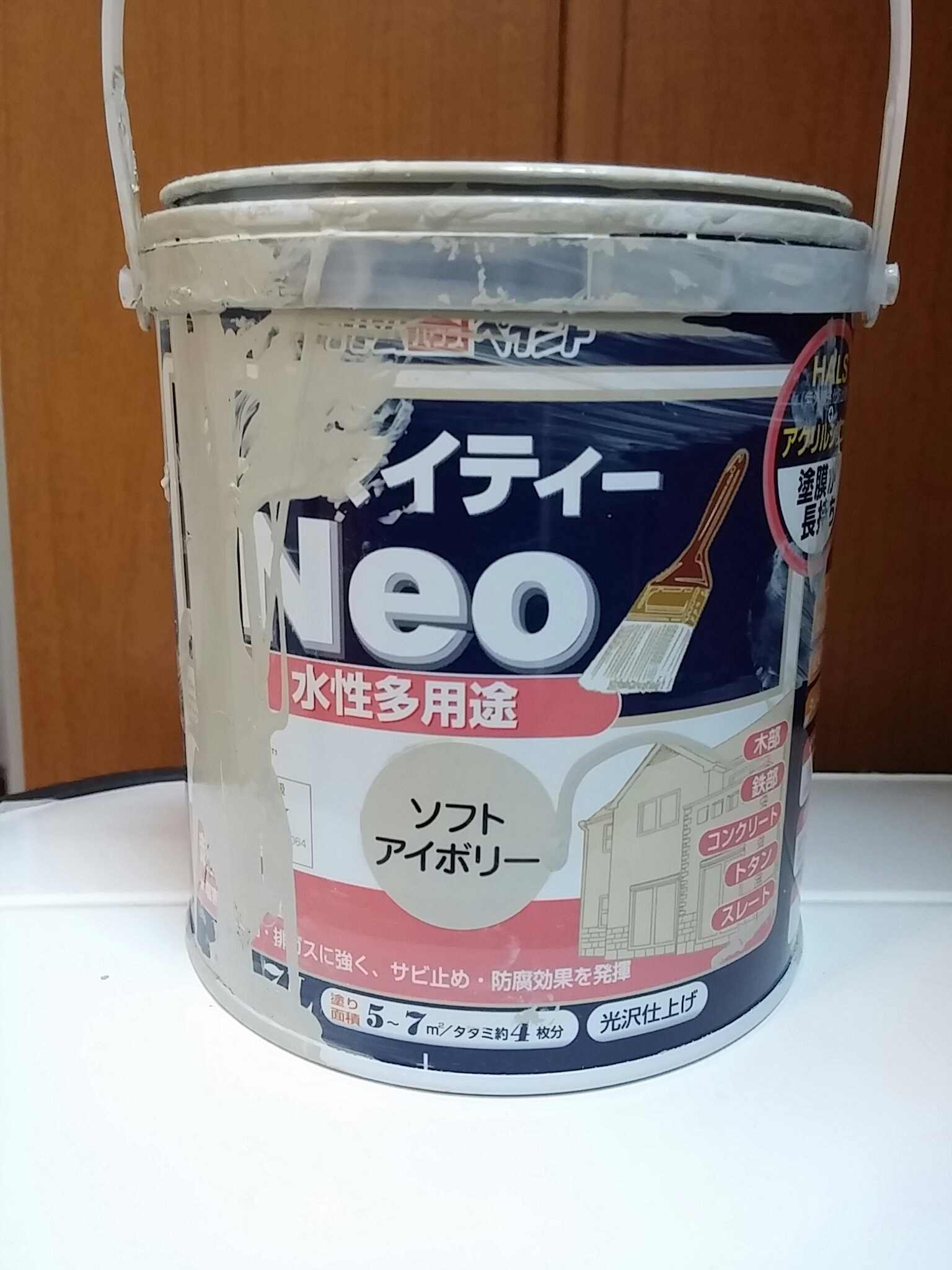 最初に水性塗料をローラーで塗って、イメージを変えます。事前に塗料がよくのるように少しサンドペーパーをかけます。塗料は水性塗料でアトムペイントのソフトアイボリーです。
